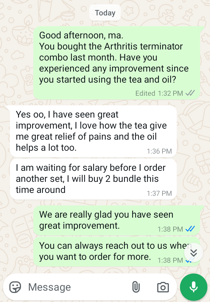 I’ve been struggling with arthritis for years, and the constant joint pain made even the simplest tasks unbearable. A friend recommended Arthritis Terminator Oil™, and I decided to give it a try. Within a few weeks, I noticed a huge difference—the stiffness in my knees reduced, and the pain in my hands disappeared. I can now move around freely and do things I haven’t done in years. This tea is truly a game changer, and I’m so grateful I found it!