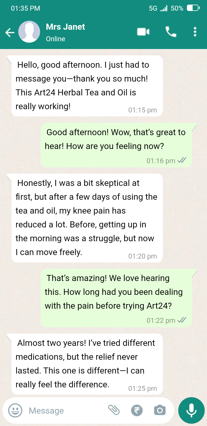 I bought this product just two months before my daughter’s wedding and used it everyday until the week of the ceremony. My joints became more flexible than they had been in years. You need to see me dancing as a proud mother at my daughter’s wedding. Thank you for this ART24™ Herbal Oil ja re. I just ordered the 3 pack for my direct elder brother too.