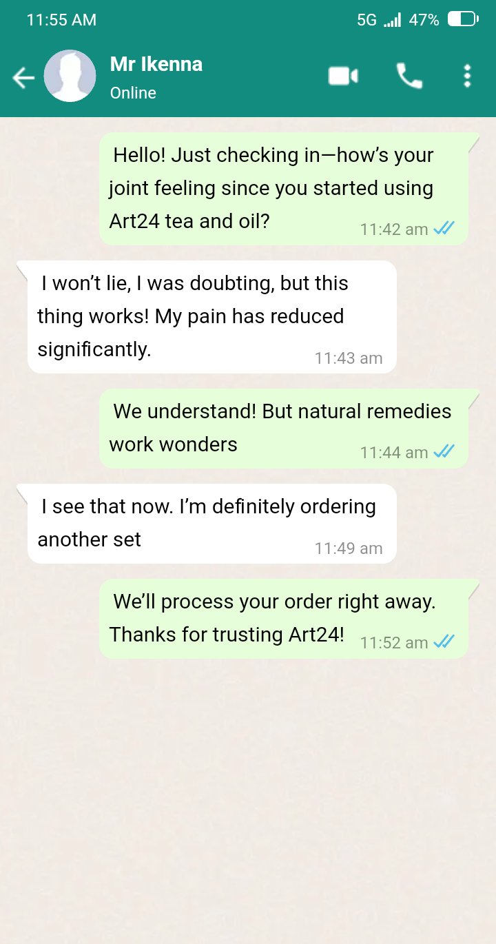 I started using this ART24™ combo in April last year after seeing the amazing testimonials of people who have used it to relieve their joint pain. I decided to give it a try and have been using it for one month plus now and my joints have become much more flexible. I can move around with less pain and stiffness. I am happy I bought this product and will buy more.